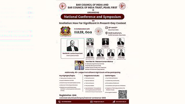 यह कार्यक्रम बार काउंसिल ऑफ इंडिया (BCI) द्वारा IIULER, गोवा के सहयोग से IIULER के ऑडिटोरियम में "मीडिएशन: आज के समय में यह कितना महत्वपूर्ण है" विषय पर आयोजित किया जा रहा है।
