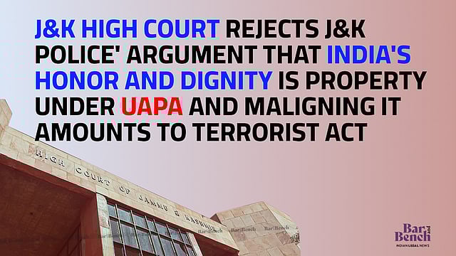 जम्मू-कश्मीर और लद्दाख उच्च न्यायालय ने हाल ही में जम्मू-कश्मीर पुलिस की इस दलील को खारिज कर दिया था कि भारत के सम्मान और गरिमा को "नुकसान" पहुंचाना गैरकानूनी गतिविधि (रोकथाम) अधिनियम (यूएपीए) के तहत एक आतंकवादी कृत्य होगा। [पीरजादा शाह फहद बनाम जम्मू-कश्मीर केंद्रशासित प्रदेश]